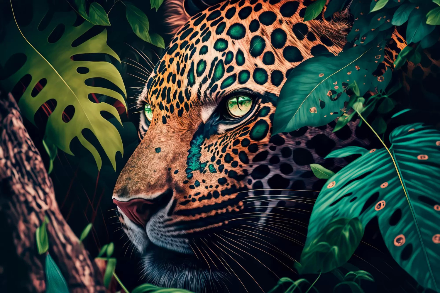 یک جگوار زیبا در حال تماشای طعمه یا محیط اطراف از مخفیگاهش در بین درختان جنگل