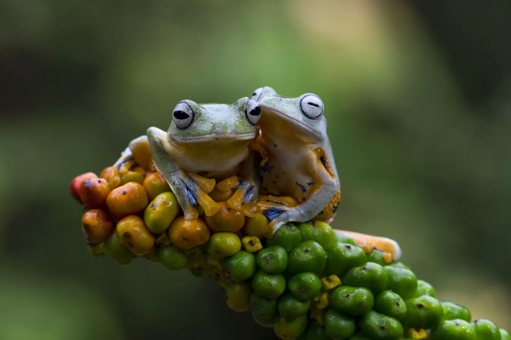 تصویر دو قورباغه درختی در کنار یکدیگر روی یک شاخه درخت