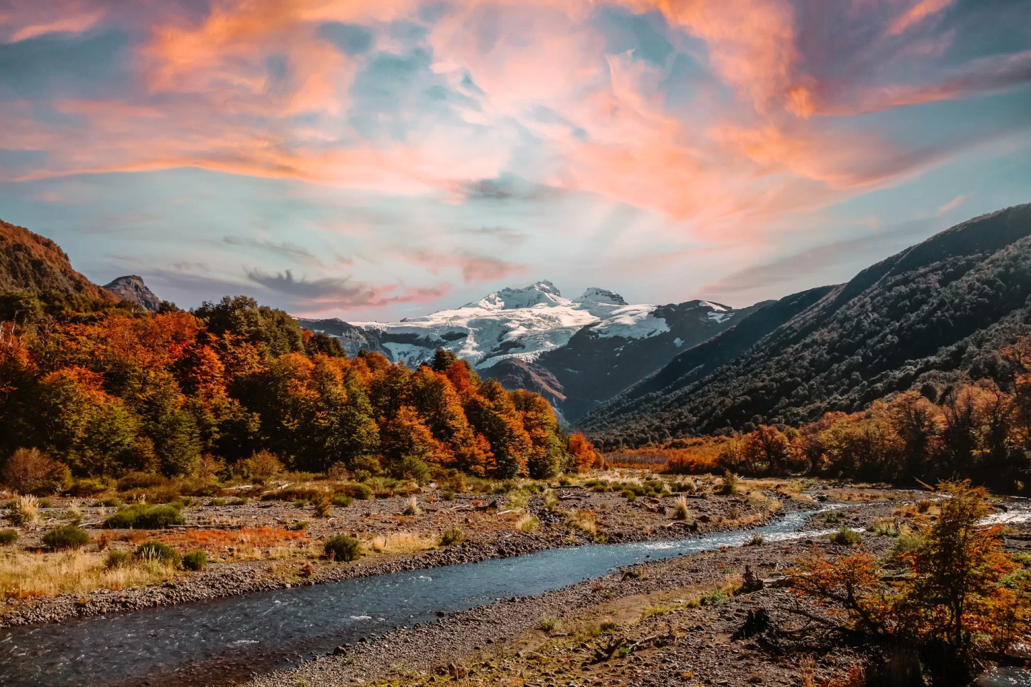 نمایی از یک کوهستان در فصل پاییز در یک روز آفتابی به همراه عبور یک رودخانه کم آب از دل آن