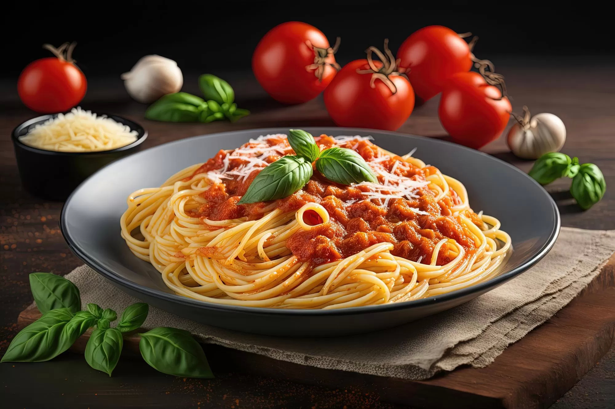 یک بشقاب ماکارونی یا اسپاگتی ایتالیایی خوشمزه تزئین شده با سس رب قرمز و گوشت چرخ کرده