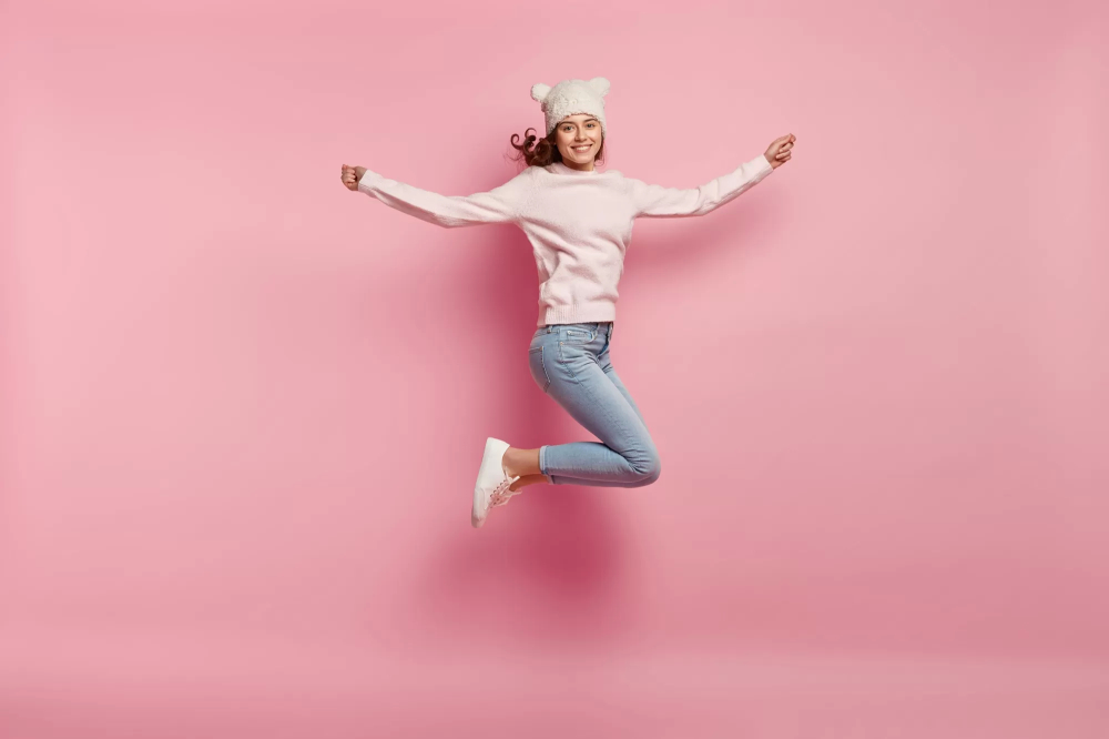 دختری جوان در حالی که کلاه بامزهای به سر دارد، از شدت خوشحالی به هوا پریده با پس زمینه رنگ صورتی