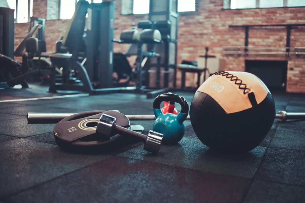 تصویر یک هاتر، دمبل، توپ ورزشی در یک باشگاه