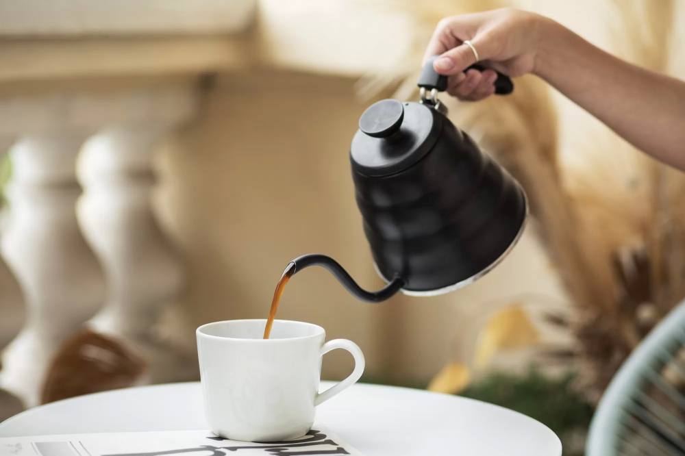 نمای یک قوری/ قهوه جوش مشکی در حال ریختن چای/ قهوه در یک فنجان سفید روی یک میز