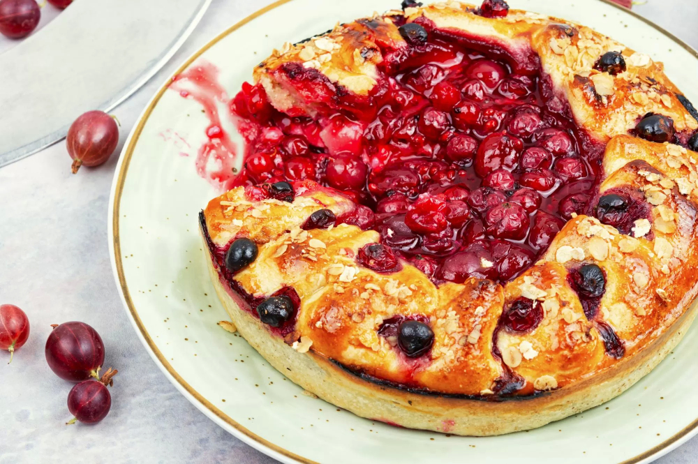 پای آلبابود گرد در یک بشقاب که با شهد آلبالو تزئین شده و روی یک میز قرار داده شده است